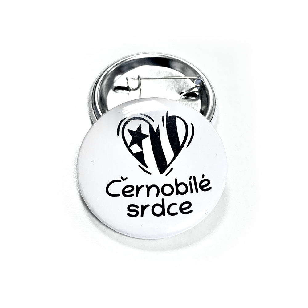 Stylová placka "Černobílé srdce" o průměru 37 mm s připínacím špendlíkem.